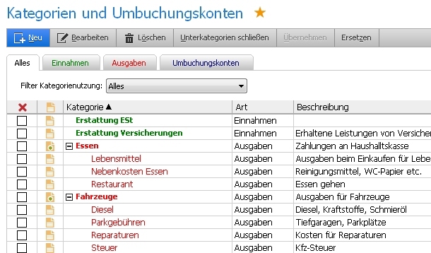 Kategorien - Einnahmen und Ausgaben