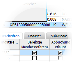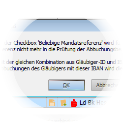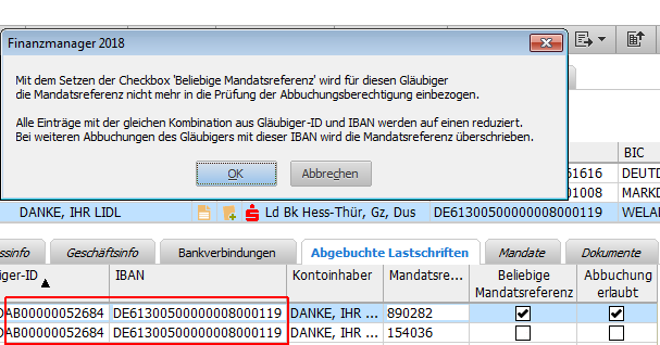 Erlauben Sie die Abbuchung mit beliebiger Mandatsreferenz indem Sie in der Liste der abgebuchten Lastschriften die beiden Checkboxen anhaken und die Meldung mit OK quittieren.