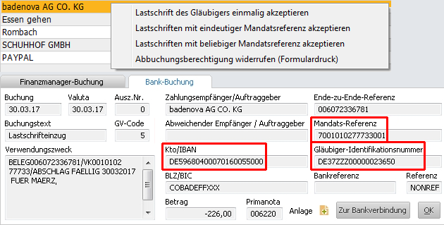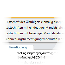 Sie können auf dem Reiter Bank-Buchung für eine abgebuchte Lastschrift die IBAN, die Mandats-Referenz und die Gläubiger-ID sehen.