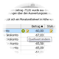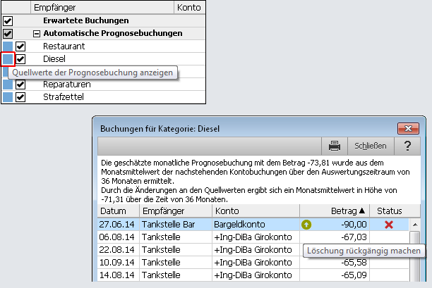 Die angezeigten Quellwerte können im Betrag für die Berechung des Prognosewerts geändert oder für die Berechnung ausgenommen (gelöscht) werden. |