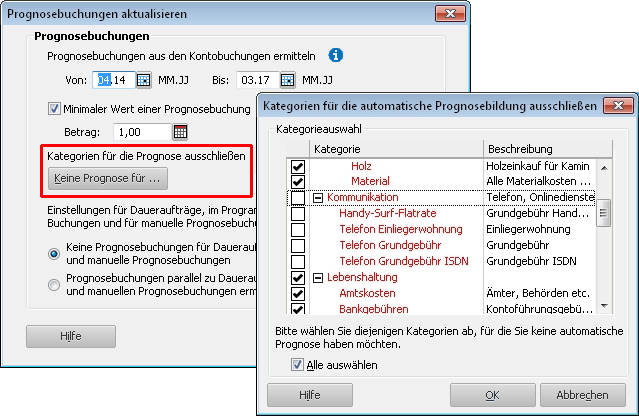 Änderungen in der FinanzprognoseDie Finanzprognose wurde nach Rückmeldungen aus der Kundenbefragung in einigen Punkten weiterentwickelt. Die Anzeige der Quellwerte wurde vereinfacht und die Quellwerte können für die Berechnung angepasst werden. Zusätzlich können Kategorien für die Erzeugung von Prognosebuchungen ausgeschlossen werden.