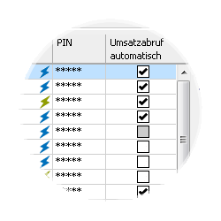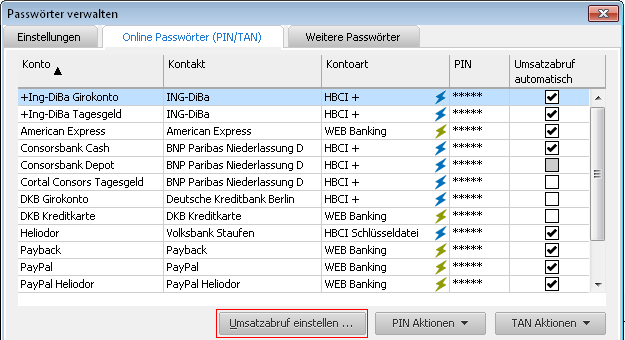 Welche Konten für den automatischen Umsatzabruf verwendet werden sollen, legen Sie im Passwort-Safe fest. Sie können den Umsatzabruf nur für die Konten nutzen, für die Sie die PIN gespeichert haben.