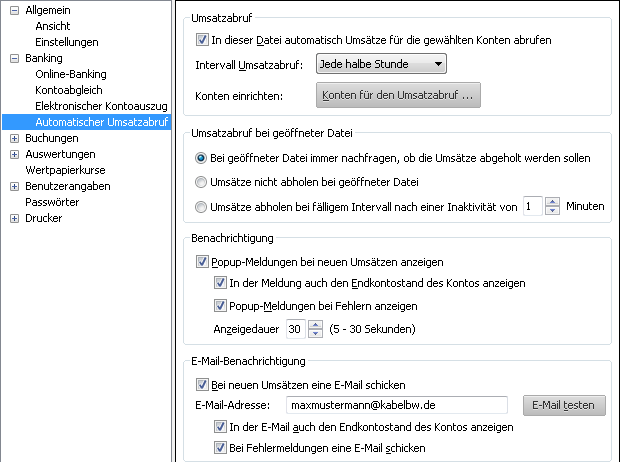 Automatischer UmsatzabrufWährend Sie in früheren Versionen zum Umsatzabruf stets den Senden-Knopf drücken mussten, können Sie jetzt die Umsätze Ihrer Konten regelmäßig einholen, auch dann, wenn der Finanzmanager gar nicht gestartet wurde. Voraussetzung in allen Fällen ist, dass die entsprechenden Konten auch online abgerufen werden können und die PINs der betroffenen Konten für den automatischen Umsatzabruf gespeichert sind. Chipkarten-Konten können nicht genutzt werden.