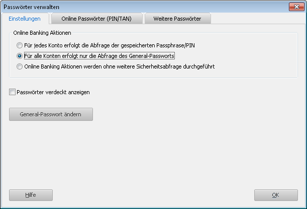 Sie können Online-Vorgänge mit der Eingabe des General-Passworts oder ohne Sicherheitsabfrage durchführen bei Konten für die Sie die PIN gespeichert haben.