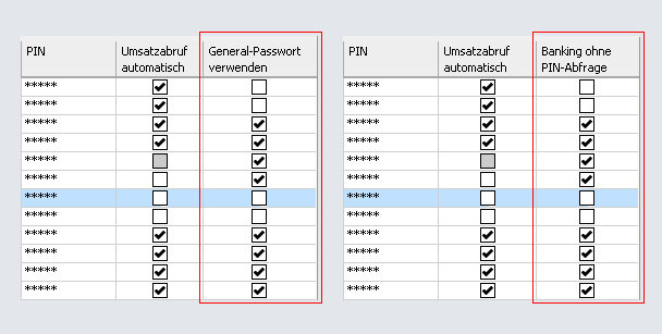 PIN-Abfrage für Online-Vorgänge differenziert einstellenErgänzend zu dem automatischen Umsatzabruf können Sie in der neuen Version auch den „normalen“ Umsatzabruf differenzierter gestalten und festlegen, ob bestimmte Konten nicht über das Generalpasswort bzw. ohne Sicherheitsabfrage, sondern über eine gezielte PIN-Abfrage abgerufen werden sollen.