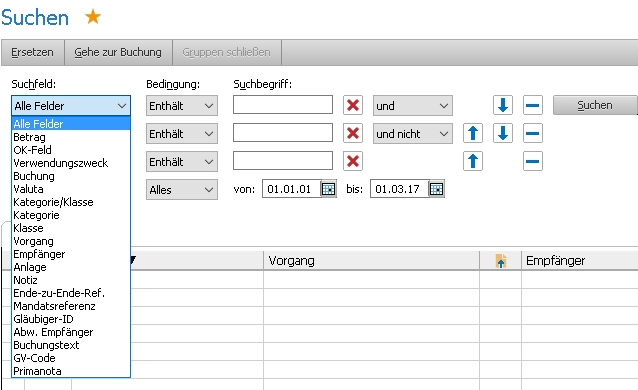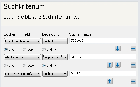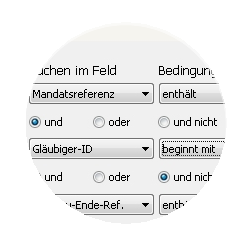 Regelverwaltung und SuchenDie neuen Felder der SEPA-Lastschriften (Mandatsreferenz, Gläubiger-ID) können Sie nun auch für die Verwaltung von Regeln und in der Suche nutzen. Zusätzlich können Sie einen neuen Operator und nicht verwenden und die Suchkriterien gegeneinander verschieben.