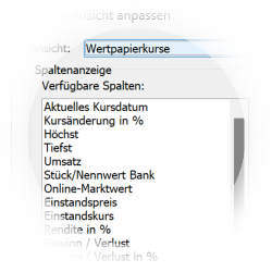 Für jede Ansicht können Sie die Anzeige der Spalten, der Konten und der Wertpapiere festlegen. - Wechseln Sie die Ansicht mithilfe des Dropdowns - den Namen der Ansicht können Sie auch anpassen. |
