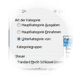 Es kann sich um eine Haupt- oder Unterkategorie für Einnahmen oder Ausgaben handeln. Falls es sich bei der Kategorie um eine Unterkategorie handeln soll, wählen Sie Unterkategorie von und selektieren Sie den Namen der übergeordneten Kategorie aus der Auswahlliste.