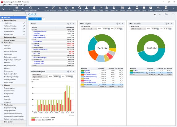 Das Cockpit stellt Ihnen in komprimierter Form Grafiken und Listen mit den gewünschten Daten rund um Ihre Finanzen zur Verfügung.