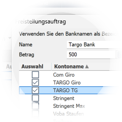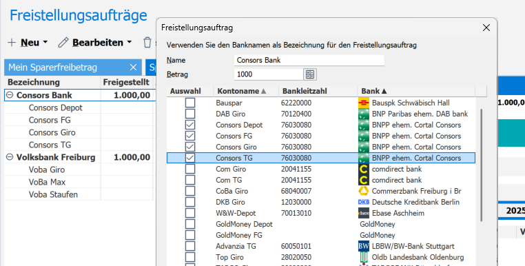 Aus einer Auswahlliste können die Konten gewählt werden, für die eine Freistellung bei einer Bank vergeben wurde.
