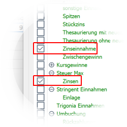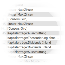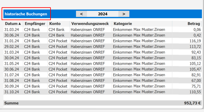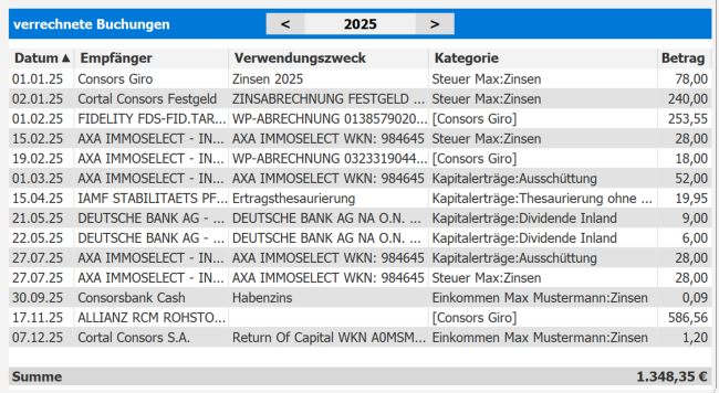 Es werden alle Buchungen aus Bankkonten angezeigt für das aktuelle Jahr, die auf die gewählte Zinskategorie gebucht wurden.