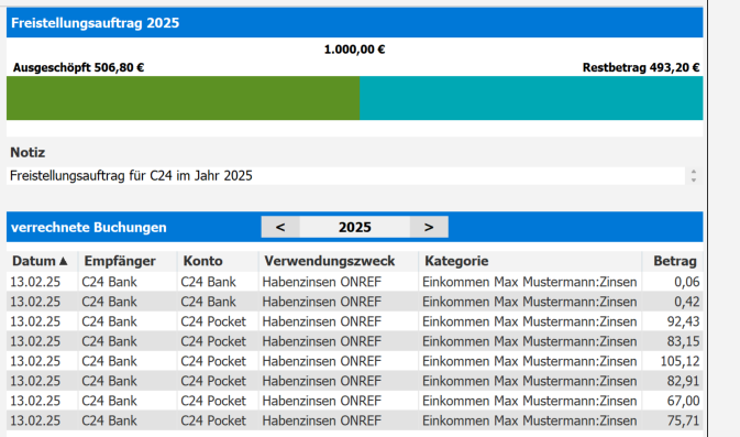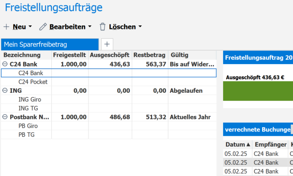 Die Buchungen, die für einen Freistellungsbetrag als ausgeschöpft eingetragen wurden, können im Detailbereich angezeigt werden.