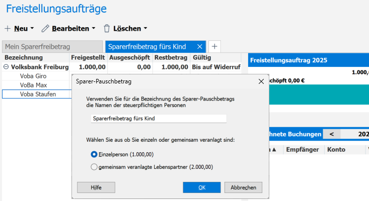 Innerhalb einer Datei lassen sich so z.B. separate Sparer-Pauschbeträge für Eltern und Kinder anlegen.