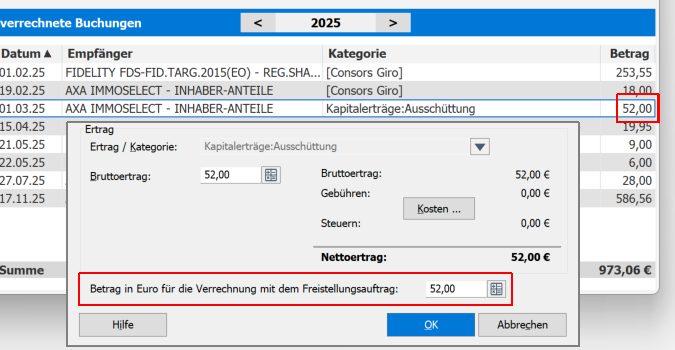 Bei der Verbuchung einer Einnahme aus Wertpapieren kann ein Betrag angegeben werden, der mit dem noch verfügbaren Freistellungsauftrag verrechnet wird.