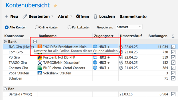 In der Kontenübersicht kann über ein Icon auf Gruppierungsebene die Umsatzabholung für alle Online-Konten dieser Gruppe gestartet werden.