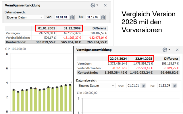 Die Vermögensentwicklung zeigt nun den gewählten Datumsbereich sowohl in der Liste als auch in der Grafik an.