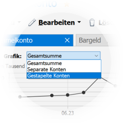 Es stehen drei unterschiedliche Arten der Grafik zur Verfügung. Eine Liniengrafik des Gesamtsaldos, eine Liniengrafik mit separaten Linien pro Konto und eine Grafik mit gestapelten Konten.