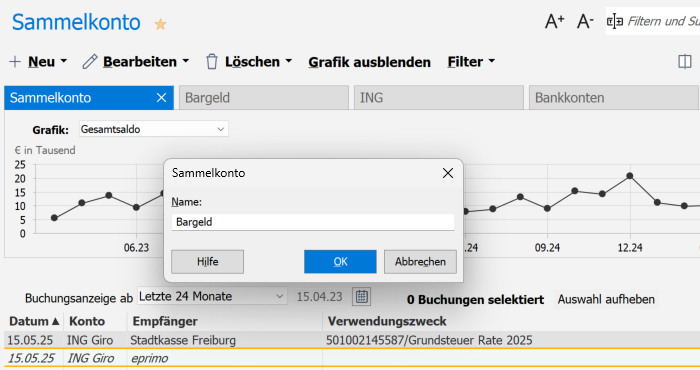 Die Grafik im Sammelkonto bildet einen Saldo auf Basis der angezeigten Buchungen ab. Wenn alle Buchungen eines Kontos angezeigt werden, entspricht der Wert dem tatsächlichen Kontostand.