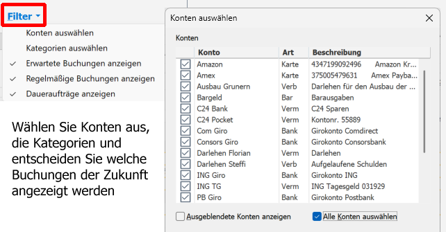 Die Möglichkeit, erwartete Buchungen, regelmäßige Buchungen und zukünftige Daueraufträge darzustellen, ermöglicht eine kontenübergreifende Vorschau auf die Liquidität.