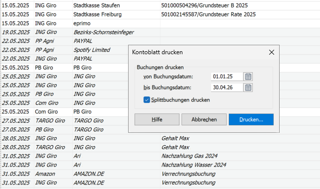 Der Ausdruck und der Export können für alle angezeigten Buchungen durchgeführt werden, einschließlich erwarteter Buchungen, regelmäßiger Buchungen und Daueraufträge.